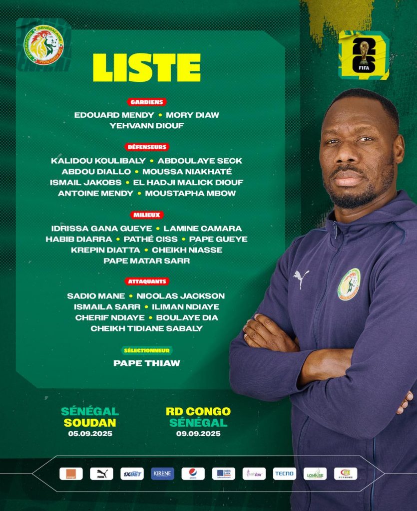 Le sélectionneur national Pape Thiaw a dévoilé ce jeudi 28 Aout 2025, la liste des 26 joueurs retenus pour les 7ᵉ et 8ᵉ journées des éliminatoires de la Coupe du Monde 2026. Ces matchs opposeront le Sénégal au Soudan le 5 octobre à Diamniadio, puis à la République Démocratique du Congo le 9 octobre à Kinshasa.